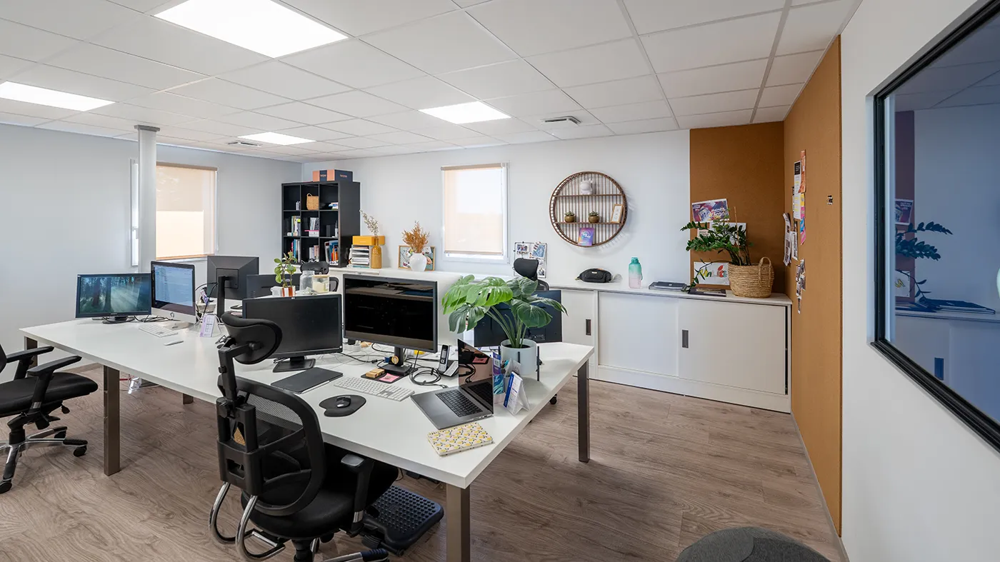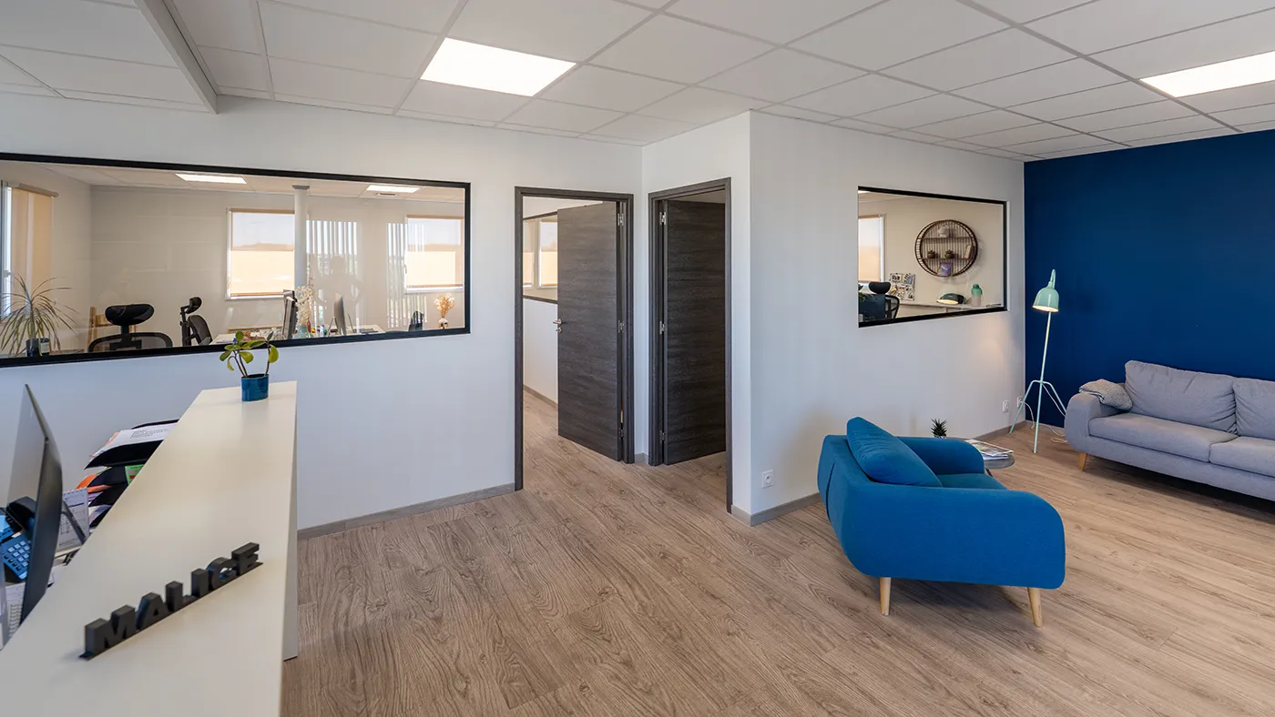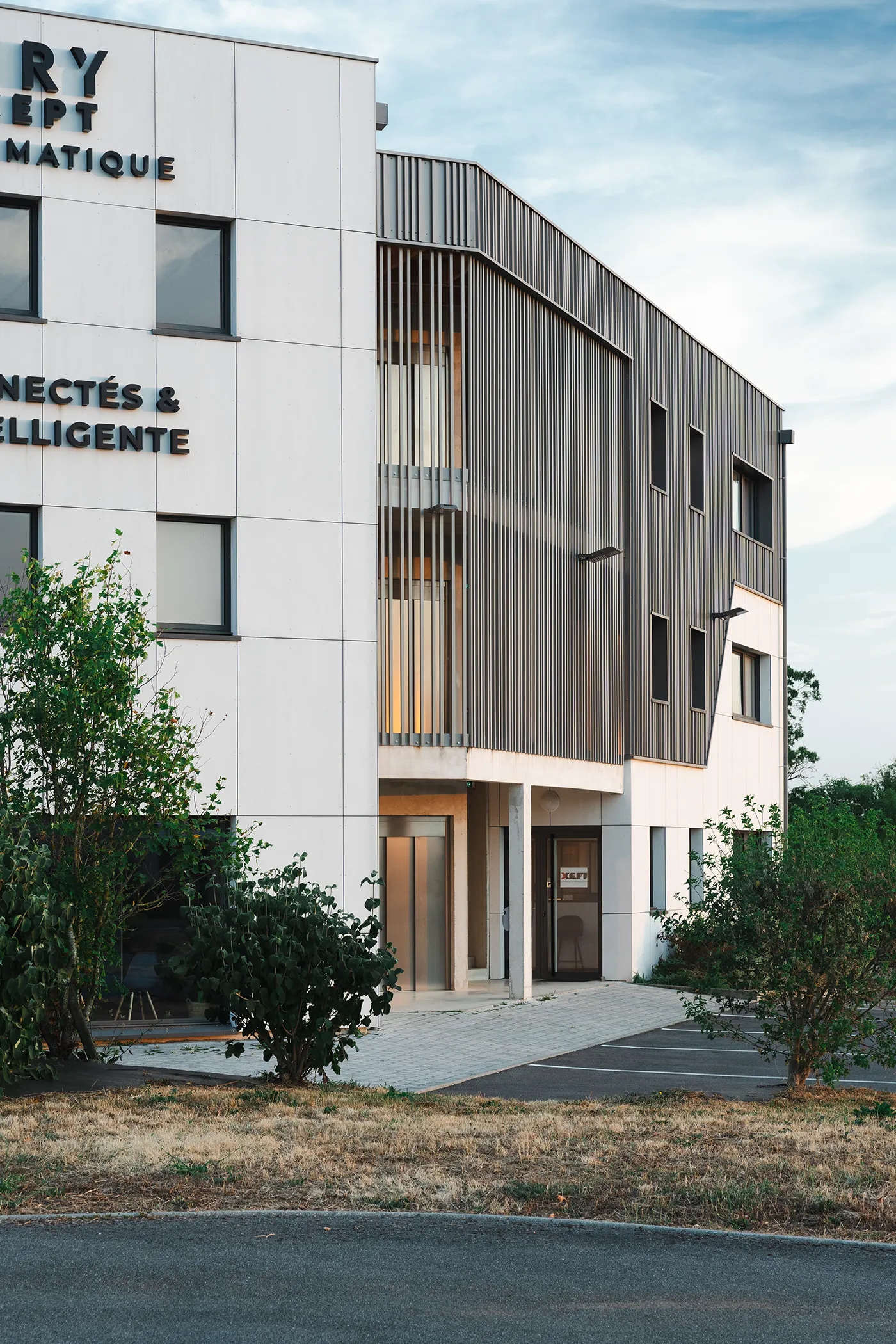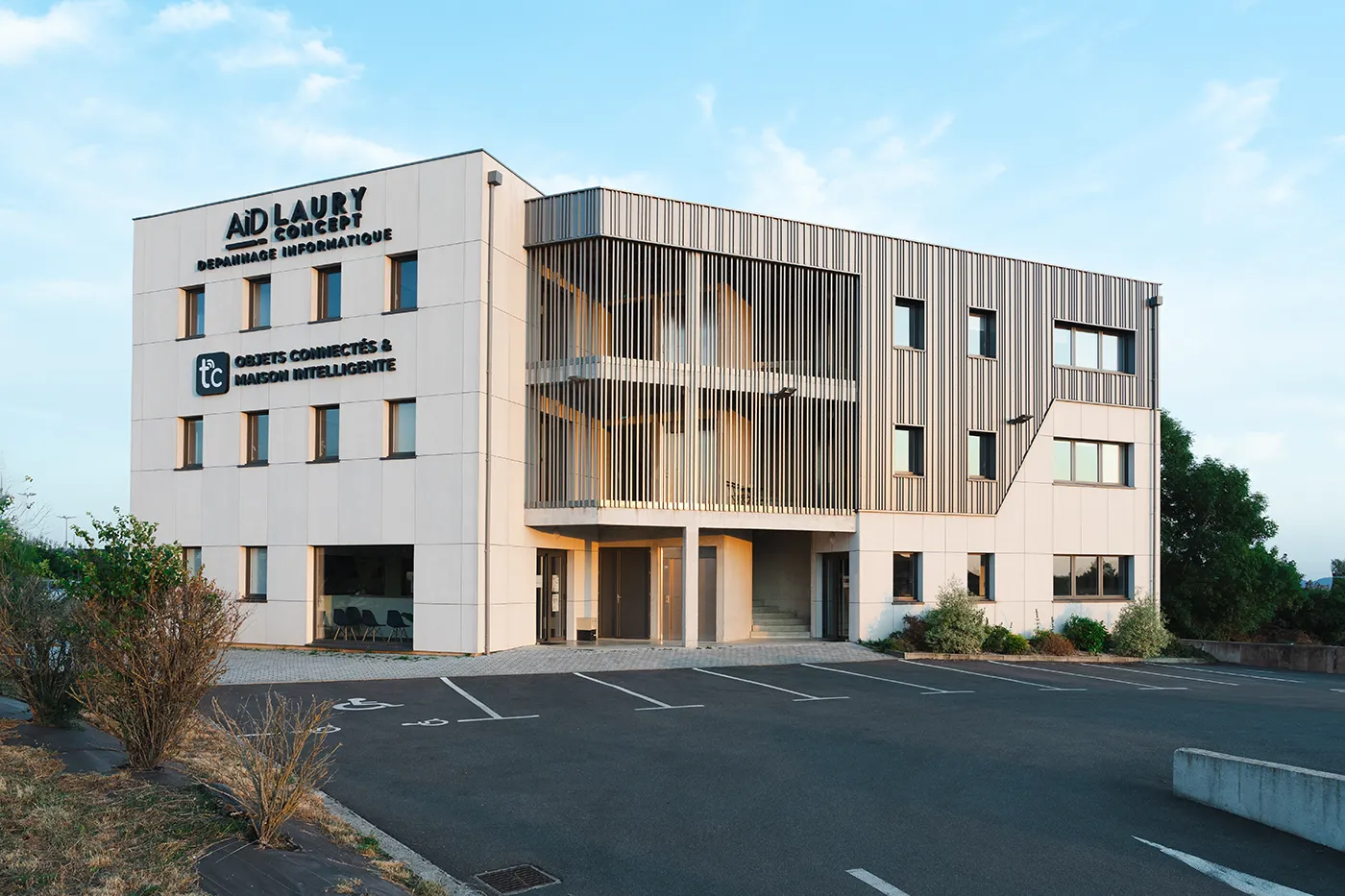 Ce bâtiment bénéfice d’un emplacement de choix au sein de la zone commerciale de l’Estréniol à Sébazac-Concourès. Toutefois, la parcelle support du projet était assez contraignante de part ses dimensions et de part les règles urbanistiques auxquelles nous devions répondre (orientation des façades principales imposée). Nous avons imaginé un bâtiment permettant d’accueillir des plateaux de bureaux d’environ 200 m² chacun pour un total d’environ 600 m² de locaux. L’idée générale était de proposer un projet qui soit à même d’assurer la visibilité et également en capacité d’être identifiable au milieu d’une zone commerciale ou l’échelle des constructions est bien plus importante. C’est ainsi que nous imaginé ce bâtiment à la fois sobre et élégant profitant de son implantation « sur un rond-point » pour faire office de sémaphore du numérique.